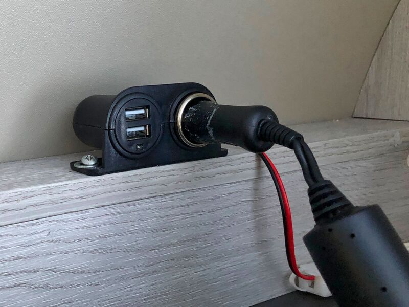 Dann haben wir eine weitere 12-Volt-Steckdose inkl. zweier USB-Ladebuchsen über Gunnars Bett im Oberschrank installiert. Diese hat eine eigene Sicherung, einen eigenen Schalter und nutzt den Stromanschluss der TV-Vorbereitung. Somit kann er jetzt komfortabel seine ganze Technik laden und auch für das APAP-Gerät muss abendlich keine "Freilandleitung" mehr verlegt werden. Mein Gunnar ist ja ordentlich & strukturiert, daher ist auch alles versteckt verlegt, kein Kabelsalat und nichts hängt rum oder man stolpert drüber – toll!