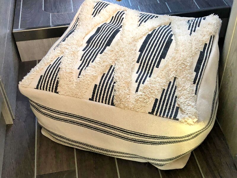 Dann haben wir vor einer Weile bei einem Youtube-Kanal, den wir gerne verfolgen, etwas entdeckt, das wir total clever finden. Das war bei Jessy und Roberto, den Chirpy Travellers. Jessy hat für ihren Van einen Wäsche-Pouf genäht, der gleichzeitig als Fußhocker dient. Wir haben diesmal auf Iris ihre Nähkünste verzichtet und einen bestellt. Dieser beinhaltet bei uns nun erst einmal die Ersatzbettwäsche und dient gleichzeitig noch als Einstiegshilfe ins Bett. Falls er uns doch mal im engen Innenraum stört, ist er ja nur aus Stoff, ist schnell zusammengerollt und unterm Bett verstaut.