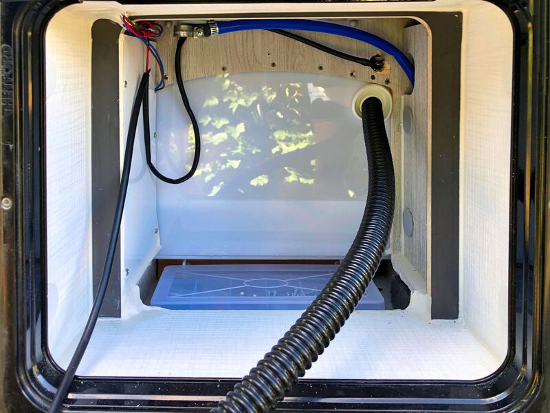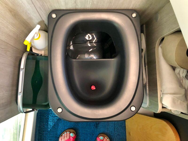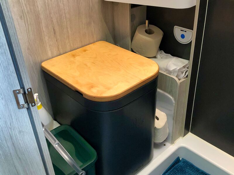 Der neue Stellplatz, Bettentopper und Fliegentür hinten kennst Du ja bereits. Nun haben wir uns auch endlich an den Umbau unserer Chemietoilette in eine Trockentrenntoilette (TTT) gewagt. Und das war ganz schön spannend, schließlich sägt man ja nicht all zu gerne an seinem fast brandneuen Van herum. Wir denken, es hat sich gelohnt. Alle Löcher sind wieder geschlossen, mehr Platz haben wir nun auch im Bad und wie das dann tatsächlich mit der Benutzung werden wird, das werden wir auch gern mit Dir teilen (ohne zu sehr ins Detail zu gehen). Wir haben uns nach einiger Recherche für eine Trelino L in schwarz entschieden. Nicht nur die vielen positiven Bewertungen sprechen für dieses Modell, sondern auch die Größe der Behälter, wir wollen ja so selten wie möglich entsorgen müssen. Selbstverständlich wurde die Trelino fachmännisch fest installiert. Sie ist mit zuschaltbarer SOG-Entlüftung ausgestattet und zum putzen auch leicht wieder komplett herausnehmbar.